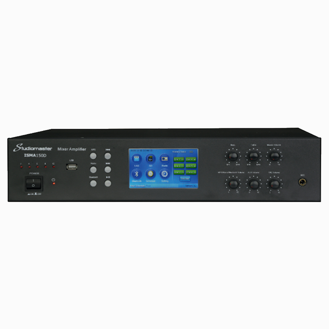 Introducing the Studiomaster ISMA150D – a 150W 100V line 2in/6 out mixer amplifier with DSP – with 150W rms output power.